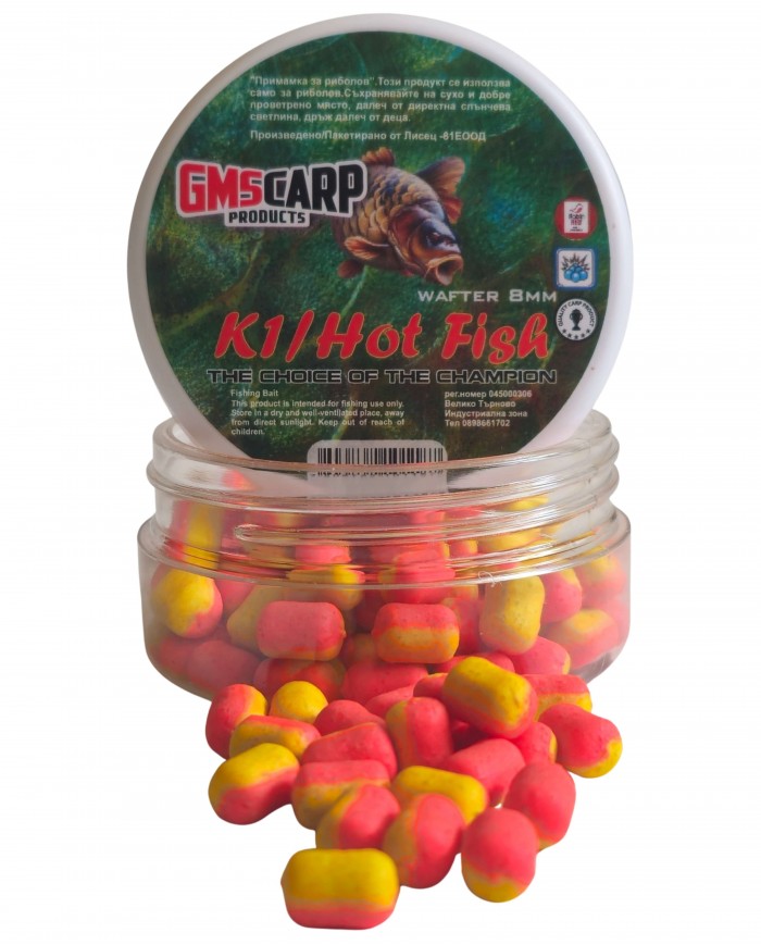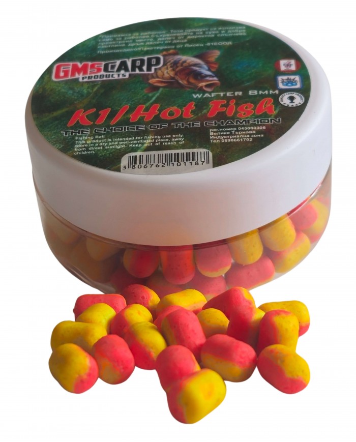 Вафтерите K1 & Hot Fish са създадени за риболовци, които търсят максимална ефективност при улов на предпазливи и мнителни риби. Техният ярък, розово жълт цвят осигуряват отлична видимост във водата, а балансираното плаващо поведение ги кара да се издигат леко над дъното – точно в полезрението на рибата.